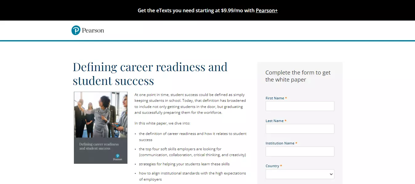 Notice how Pearson’s lead capture form asks the user to provide more than just the basic name and email fields for access to their white paper on Defining Career Readiness and Student Success.