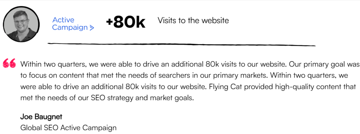 Flying Cat Marketing is a well-known SaaS SEO agency for B2B that helps SaaS and technology brands achieve organic growth seamlessly with robust SEO strategies. Founded in 2018, Flying Cat specializes in creating and implementing full-service SEO packages for clients and helps them overcome some of the biggest growth challenges.