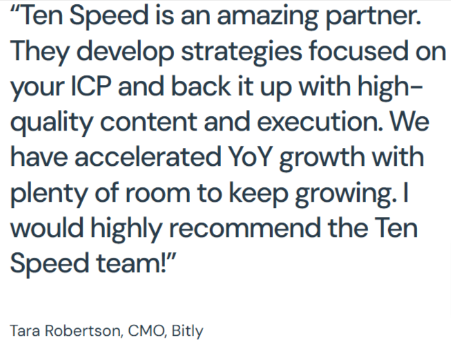 Ten Speed has served companies operating in several industries, however, the primary focus of the agency is serving B2B SaaS companies.