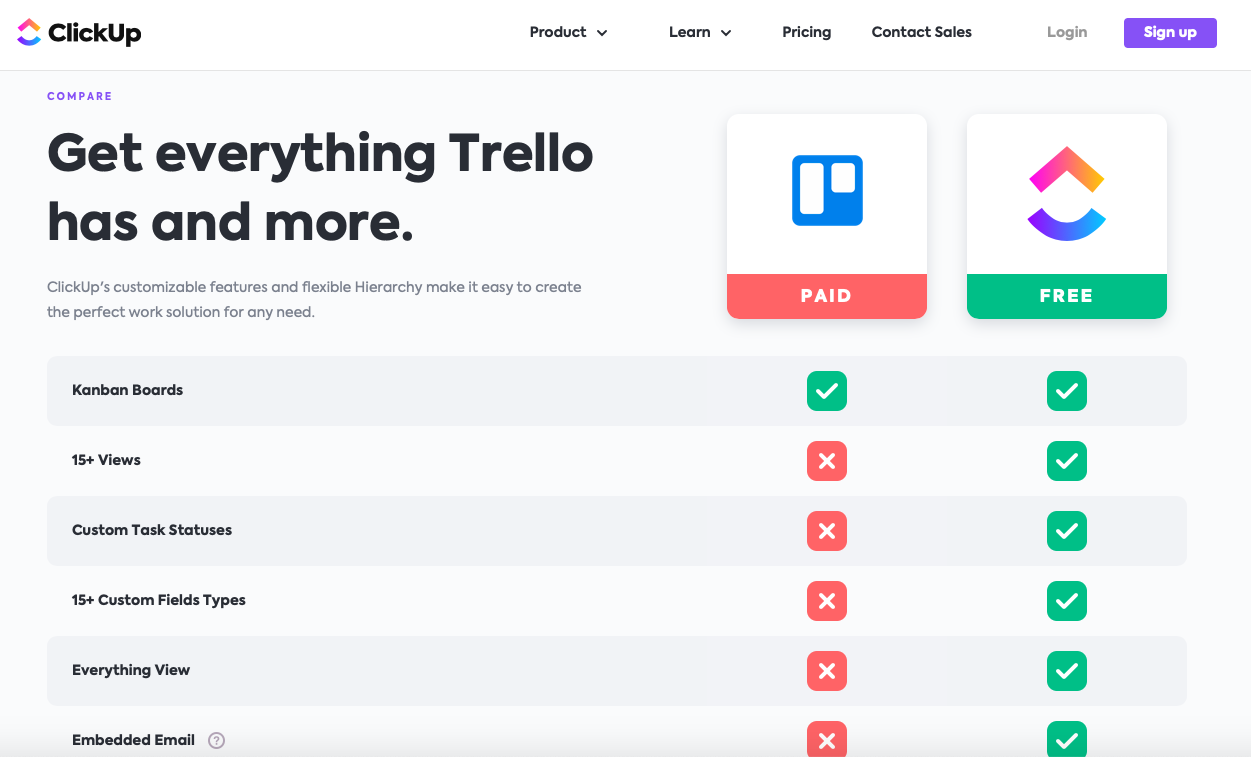 It has created a series of comparison pages, comparing its best features with the competitor. One of them is with Trello as shown below.