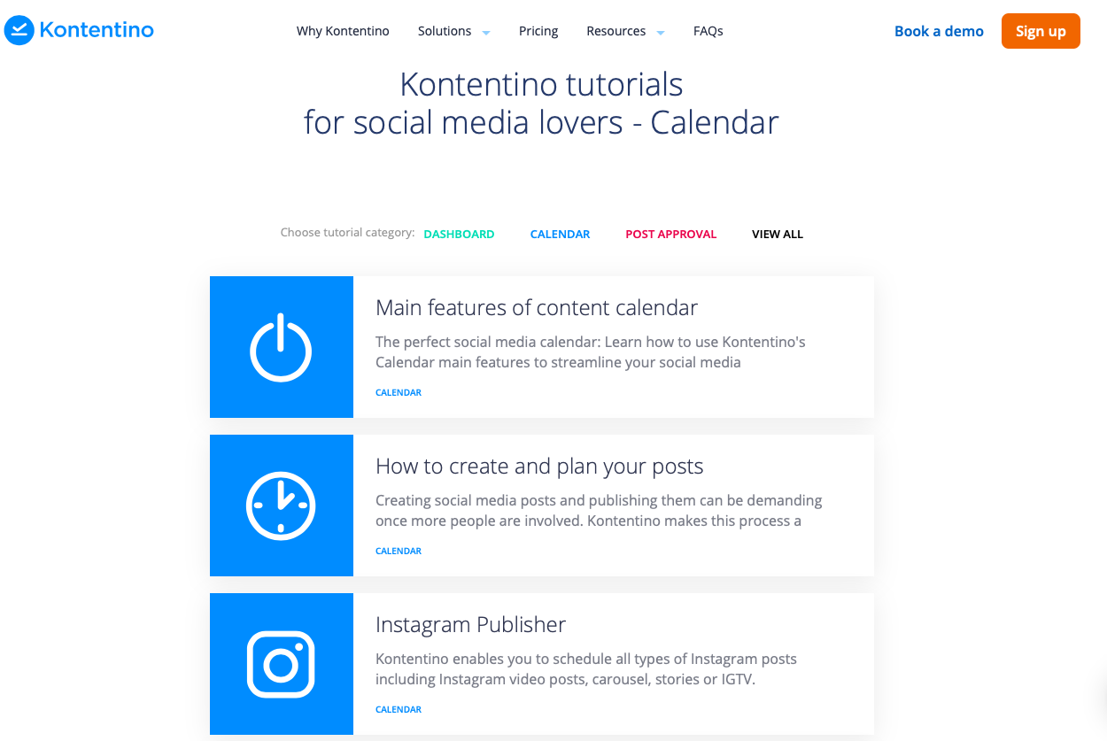Aside from the overall demo, interested customers often like to know about specific features in-depth. Create informative tutorials on each of your features, whether as a blog post or as an animated video. You can also design these as courses that guide your customer through real-life applications of each feature — just how social media workflow designer Kontentino does.