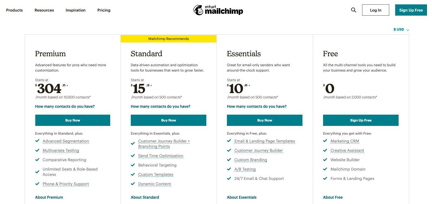 You can promote this page via email and even do mini-tutorials on who would benefit most from each plan. This will help customers who might be dilly-dallying over the price make a quicker decision. Mailchimp does a fantastic job with its pricing page.