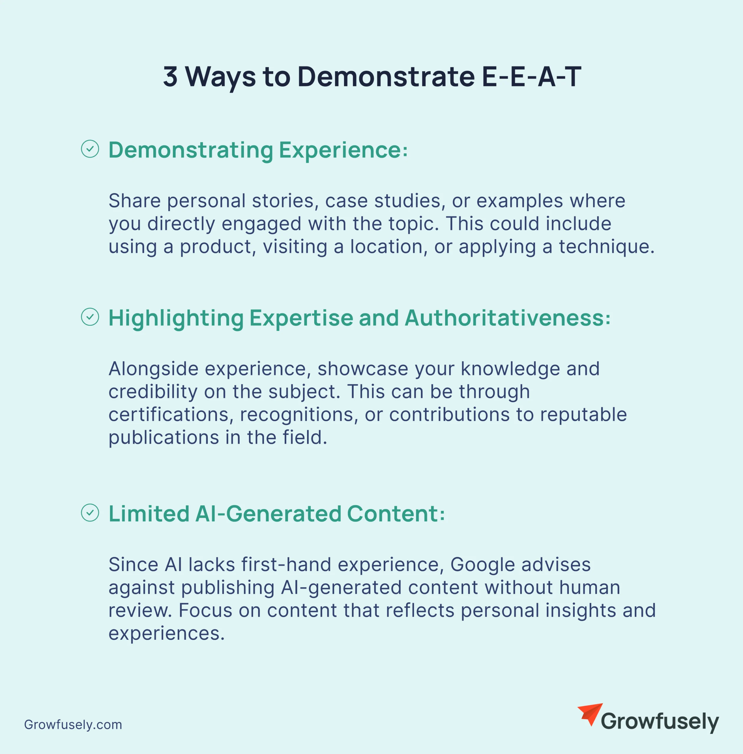 To demonstrate E-E-A-T, Search Engine Journal’s Senior News Writer Matt G. Southern recommends: