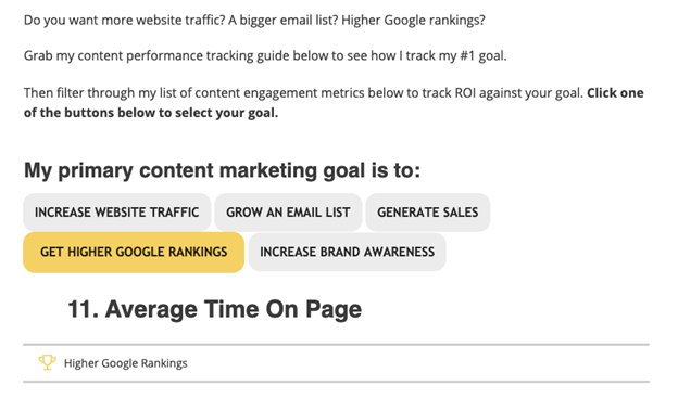 Instead of skimming through an enormous list of metrics to learn about how to achieve their particular desired content marketing goal, all readers have to do is click on the goal they want to achieve, and those metrics are brought up.