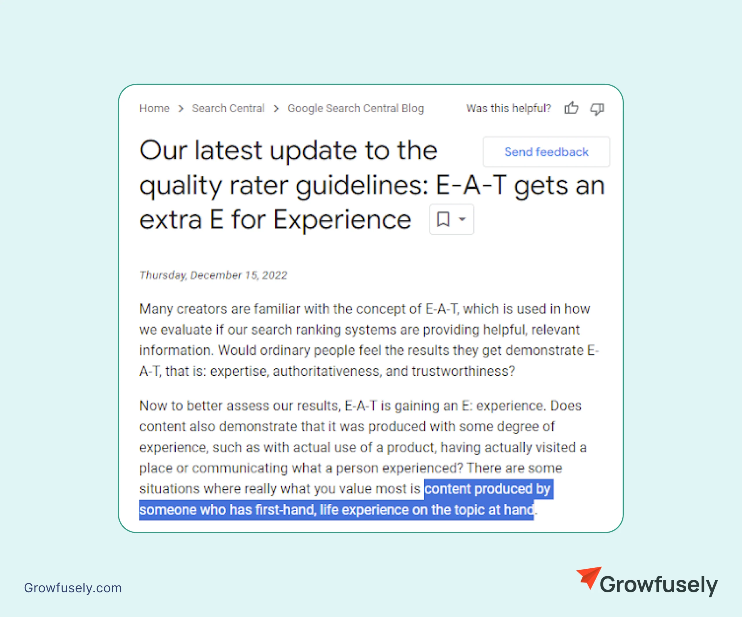 Expertise, Authoritativeness, and Trustworthiness isn’t enough to give your boost your content to the first page of the SERPs. Your blog content will be more valued by search engines if they come from your Experience, as they clearly state: