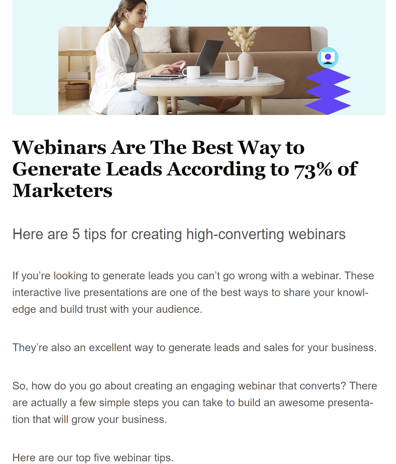The idea is simple: provide a brief summary or introduction of your article to give your subscribers a sneak peek into the content and highlight the key takeaways or benefits they can expect. Then, add a CTA to the full article on your website. You can also do this for multiple articles at once as a monthly roundup newsletter. Here’s an example from Leadpages, a landing page builder platform: