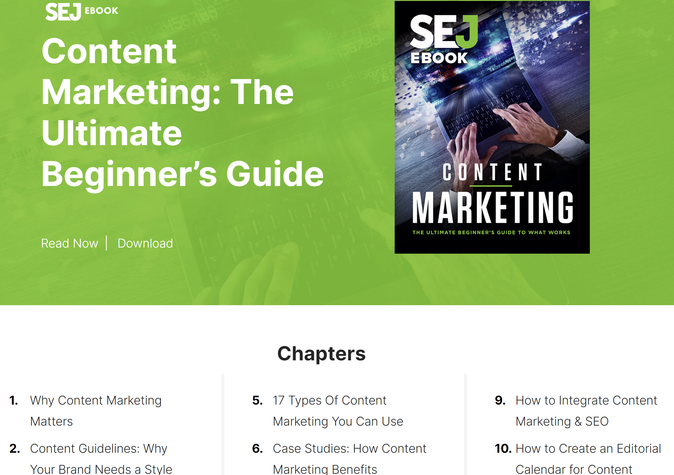 Or, if you’d like to gate your content and collect email leads, then repackaging them into an ebook is also a good idea. Some people prefer a downloadable ebook that they can read later, so this repurposing strategy can work well, too. For instance, Search Engine Journal (SEJ) — the popular SEO resource — took this route with their article series about Content Marketing. They have ten free-to-read articles on the subject but also offer a more in-depth ebook downloadable: