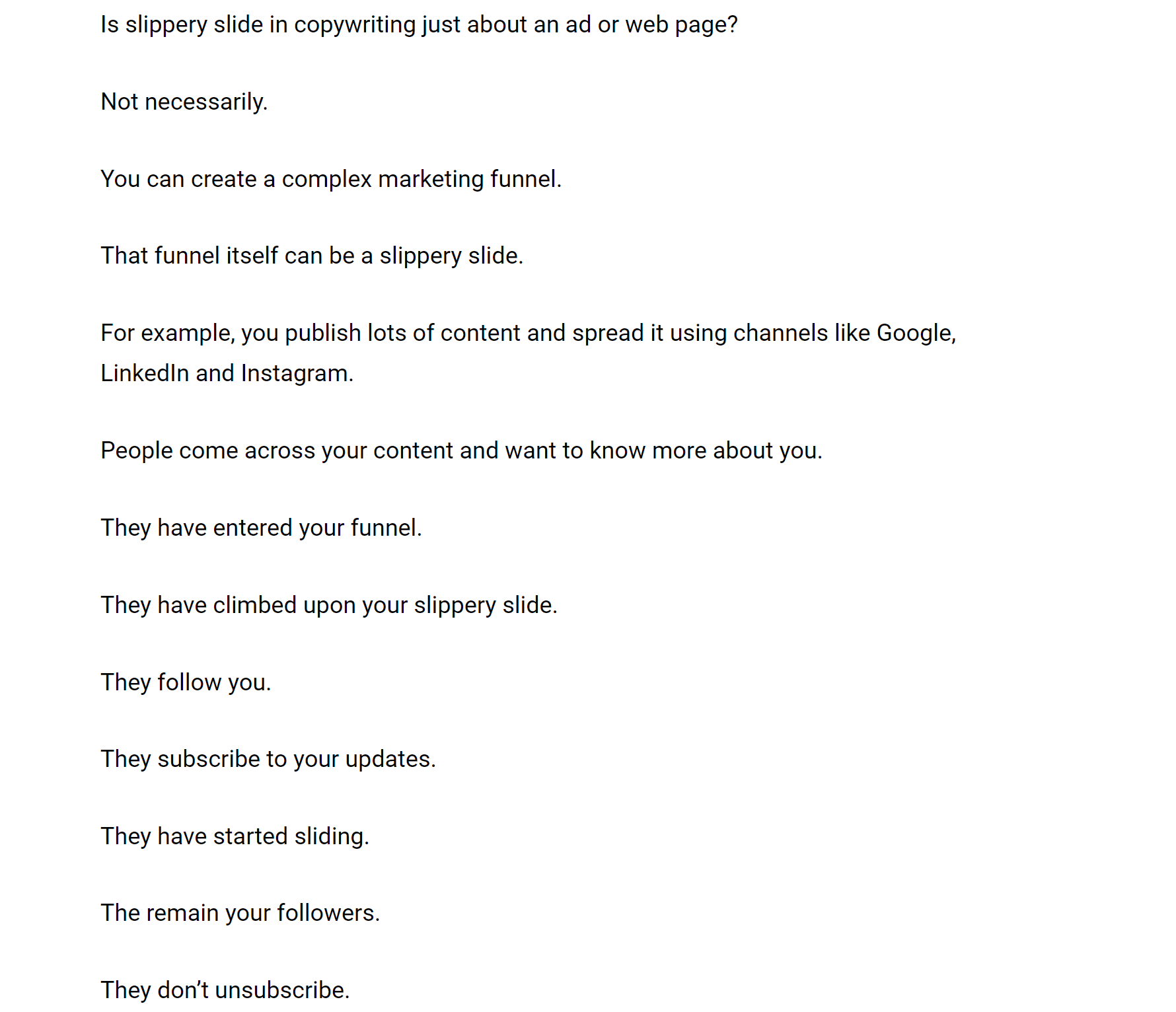 You can apply the same principle to repurposing your articles into LinkedIn posts that flow like a slippery slide (you can’t help but go from one line to the next until the very end):
