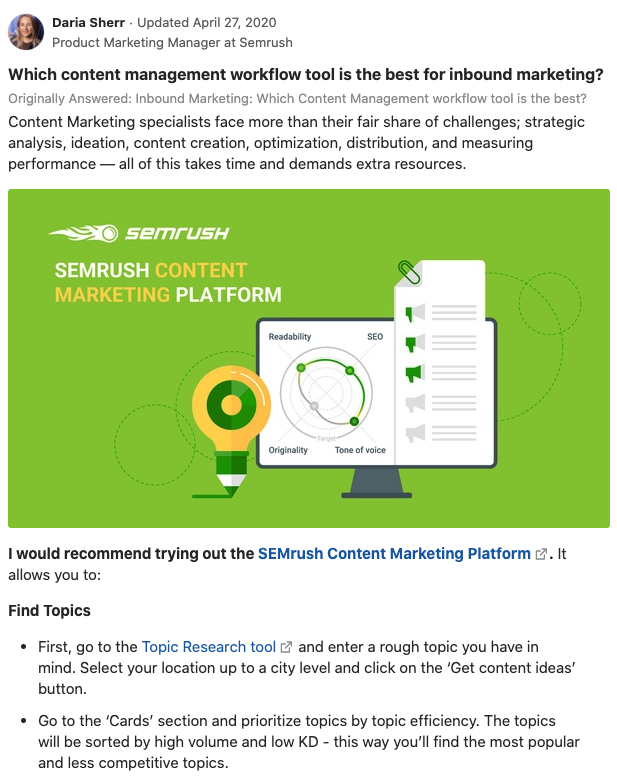If your answer to a user’s question is highly relevant to them, you’ll have permanent content posted on the internet for future readers who are interested in the same solution. This will continue to passively drive traffic and generate top-of-funnel interest months after the original answer is submitted.