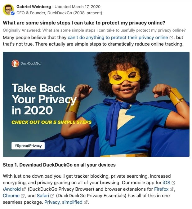 Below is an example of DuckDuckGo, an internet browser which protects users’ privacy, leveraging the right questions to mention their brand: