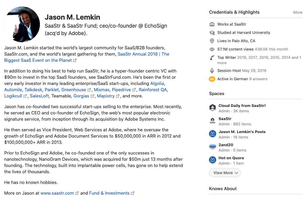 It is important to make sure that you have a great profile on Quora. Jason Lemkin, the prominent entrepreneur and investor, has a well-optimized Quora profile, as shown below. Pay special attention to his credentials and notable achievements listed prominently below his name, as well as his bio which establishes his credibility in a clear and concise manner.