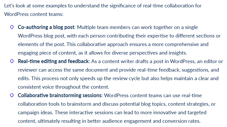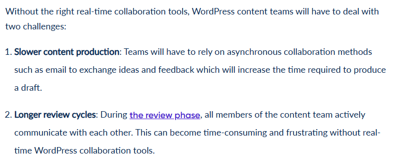The three points about the benefits of real-time collaboration made their way into the final draft after we cross-verified them with content teams that use WordPress.