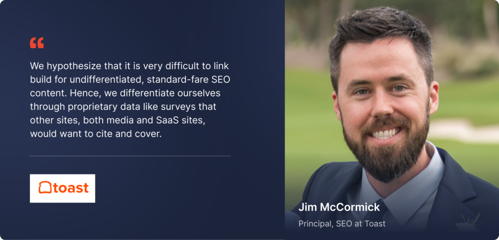 We hypothesize that it is very difficult to link build for undifferentiated, standard-fare SEO content. Hence, we differentiate ourselves through proprietary data like surveys that other sites, both media and SaaS sites, would want to cite and cover.